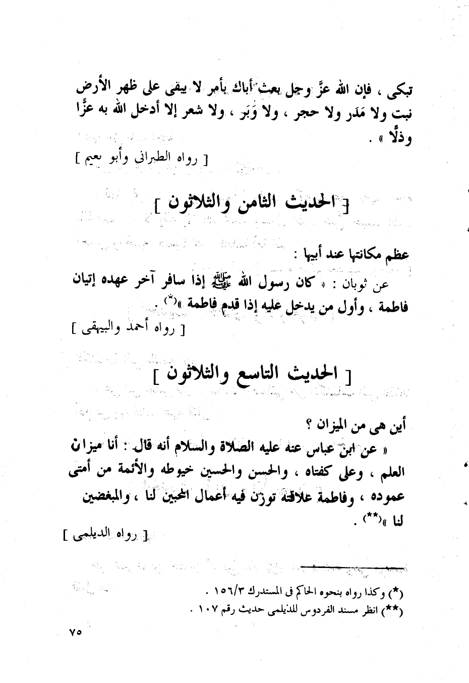 (عن ابن عباس عنه عليه الصلاة والسلام أنه قال: أنا ميزان العلم، وعلى كفتاه، والحسن والحسين خيوطه والأئمة من أمتى عموده، وفاطمة علاقته توزن فيه أعمال المحبين لنا، والمبغضين لنا) .