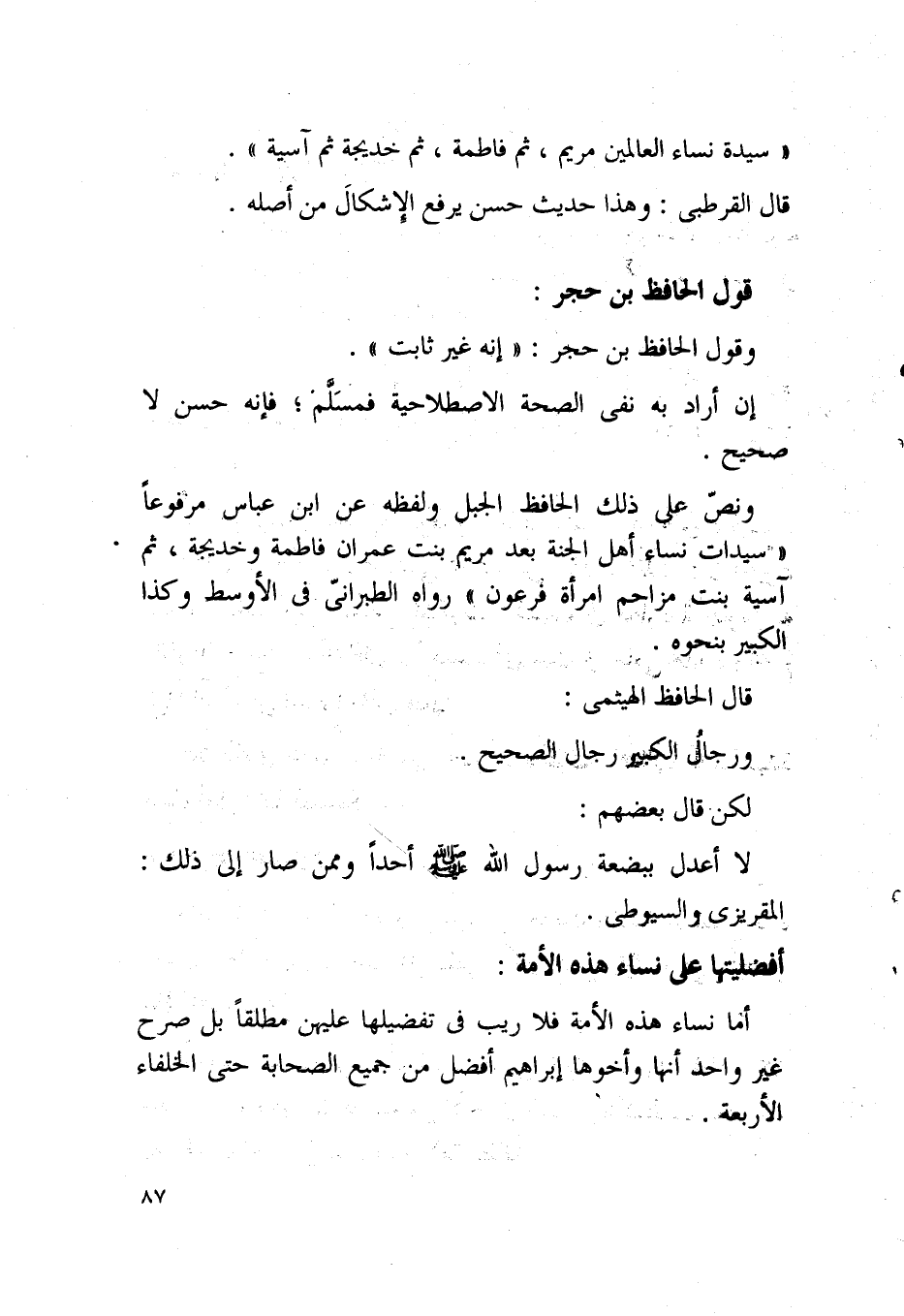 أفضليتها على نساء هذه الأمة: أما نساء هذه الأمة فلا ريب في تفضيلها عليهن مطلقا بل صرح غير واحد أنها وأخوها إبراهيم أفضل من جميع الصحابة حتى الخلفاء الأربعة.