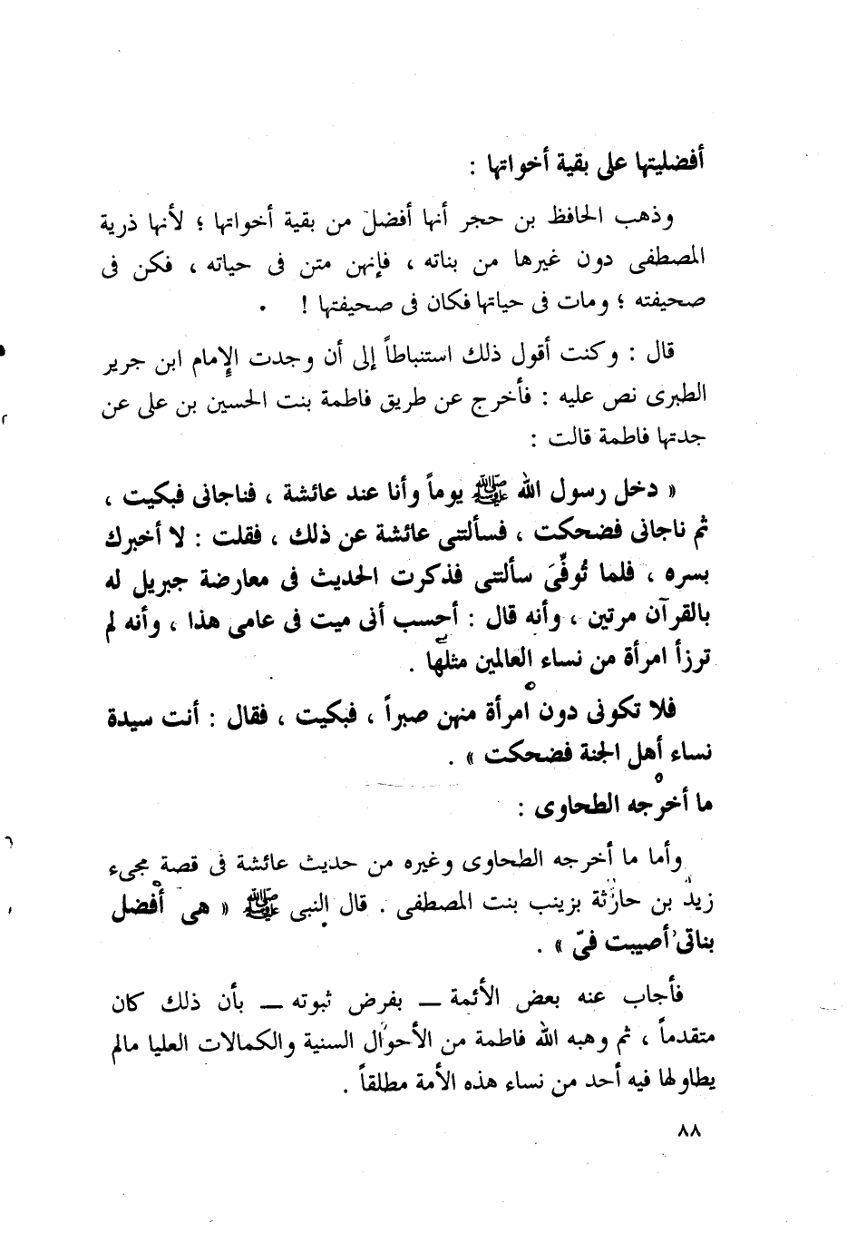 وذهب الحافظ بن حجر أنها أفضل من بقية أخواتها؛ لأنها ذرية المصطفى دون غيرها من بناته، فإنهن متن في حياته، فكن في صحيفته؛ ومات في حياتها فكان في صحيفتها! قال: وكنت أقول ذلك استنباطا إلى أن وجدت الإمام ابن جرير الطبرى نص عليه: فأخرج عن طريق فاطمة بنت الحسين بن على بن جدتها فاطمة قالت: (دخل رسول الله صلى الله عليه وسلم يوما وأنا عند عائشة، فناجاني فبكيت، ثم ناجاني فضحكت، فسألتني عائشة عن ذلك، فقلت: لا أخبرك بسره، فلما توفى سألتني فذكرت الحديث في معارضة جبريل له بالقرآن مرتين، وأنه قال: أحسب أني ميت في عامى هذا، وأنه لم ترزأ امرأة من نساء العالمين مثلها.