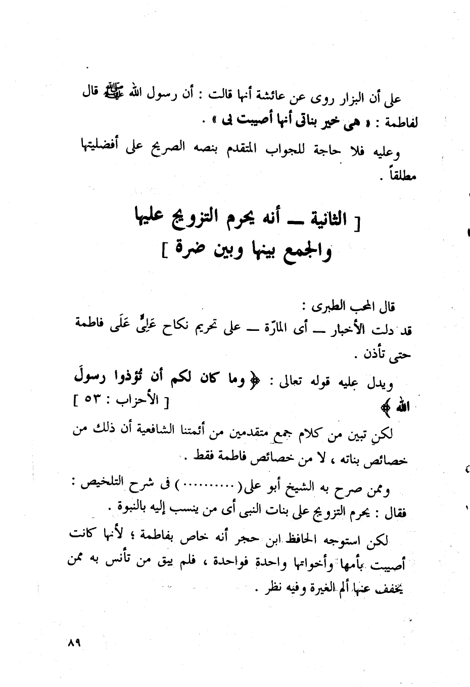 ويدل عليه قوله تعالى: (وَما كانَ لَكُم أَن تُؤذوا رَسولَ اللَهِ) لكن تبين من كلام جمع متقدمين من أئمتنا الشافعية أن ذلك من خصائص بناته، لا من خصائص فاطمة فقط.