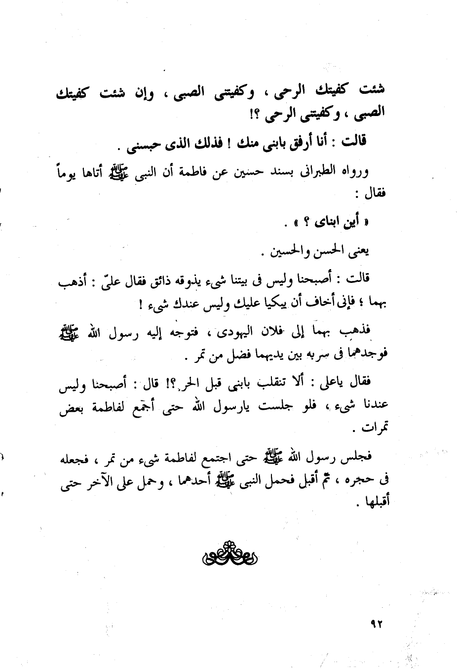 قالت: أصبحنا وليس في بيتنا شيء يذوقه ذائق فقال على: أذهب بهما؛ فإني أخاف أن يبكيا عليك وليس عندك شيء! فذهب بهما إلى فلان اليهودي، فتوجه إليه رسول الله صلى الله عليه وسلم فوجدهما في سربه بين يديهما فضل من تمر.