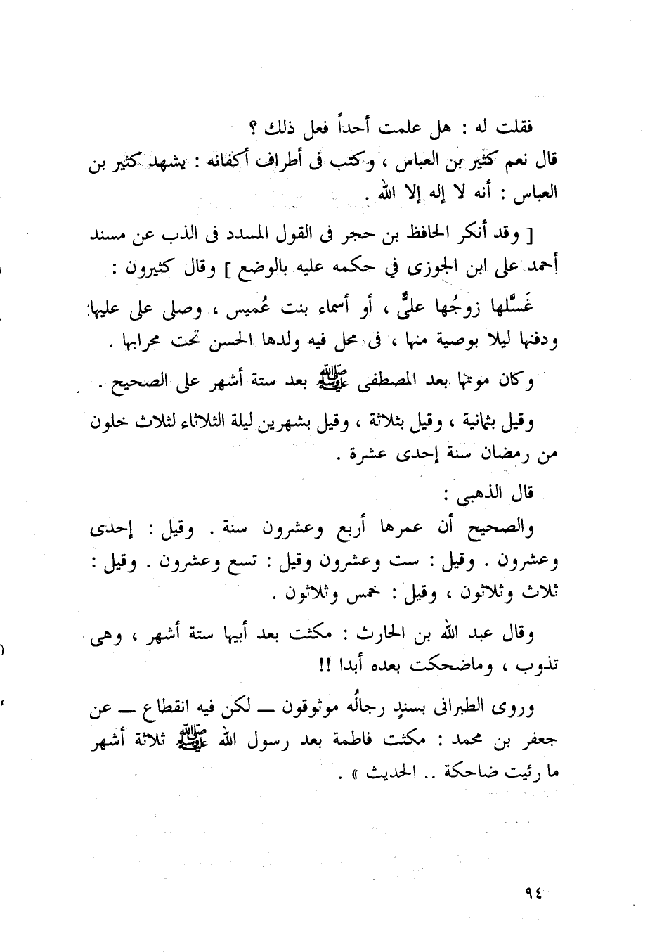 وقال عبد الله بن الحارث: مكثت بعد أبيها ستة أشهر، وهي تذوب، وما ضحكت بعده أبدا!! وروى الطبراني بسند رجاله موثوقون - لكن فيه انقطاع - عن جعفر بن محمد: مكثت فاطمة بعد رسول الله صلى الله عليه وسلم ثلاثة أشهر ما رئيت ضاحكة..الحديث) .
