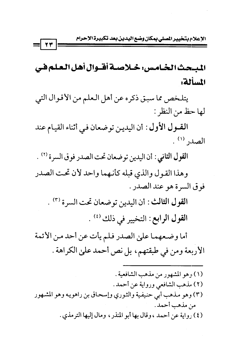أما وضعهما على الصدر فلم يأت عن أحد من الأئمة الأربعة ومن في طبقتهم، بل نص أحمد على الكراهية