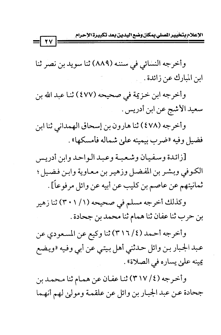 (زائدة وسفيان وشعبة وعبد الواحد وابن إدريس الكوفي وبشر بن المفضل وزهير بن معاوية وابن فضيل، ثمانيتهم عن عاصم بن كليب عن أبيه عن وائل مرفوعا).