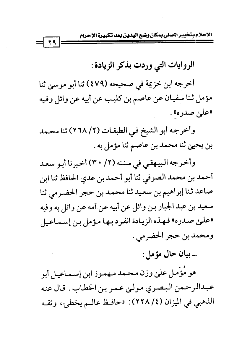 وأخرجه البيهقي في سننه (2/ 30) أخبرنا أبو سعد أحمد بن محمد الصوفي ثنا أبو أحمد بن عدي الحافظ ثنا ابن صاعد ثنا إبراهيم بن سعيد ثنا محمد بن حجر الحضرمي ثنا سعيد بن عبد الجبار بن وائل عن أبيه عن أمه عن وائل به وفيه (على صدره) فهذه الزيادة انفرد بها مؤمل بن إسماعيل ومحمد بن حجر الحضرمي.