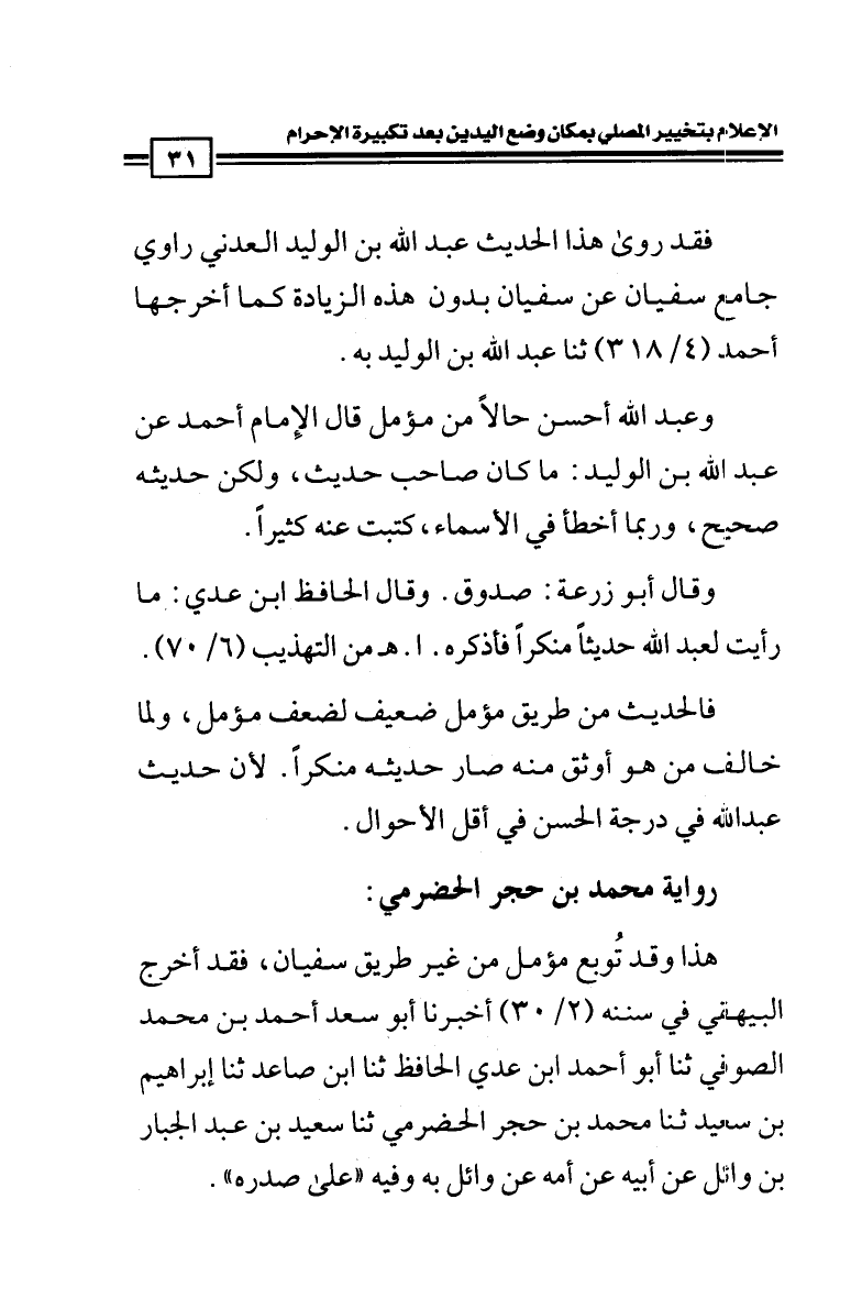 هذا وقد تُوبع مؤمل من غير طريق سفيان، فقد أخرج البيهقي في سننه (2/ 30) أخبرنا أبو سعد أحمد بن محمد الصوفي ثنا أبو أحمد بن عدي الحافظ ثنا ابن صاعد ثنا إبراهيم بن سعيد ثنا محمد بن حجر الحضرمي ثنا سعيد بن عبدالجبار بن وائل عن أبيه عن أمه عن وائل به وفيه (على صدره).