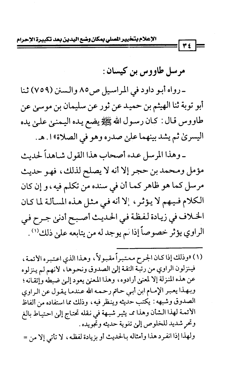 - رواه أبو داوود في المراسيل ص 85 والسنن (759) ثنا أبو توبة ثنا الهيثم بن حميد عن ثور عن سليمان بن موسى عن طاووس قال: كان رسول الله صلى الله عليه وسلم يضع يده اليمنى على يده اليسرى ثم يشد بينهما على صدره وهو في الصلاة) ا. ه.