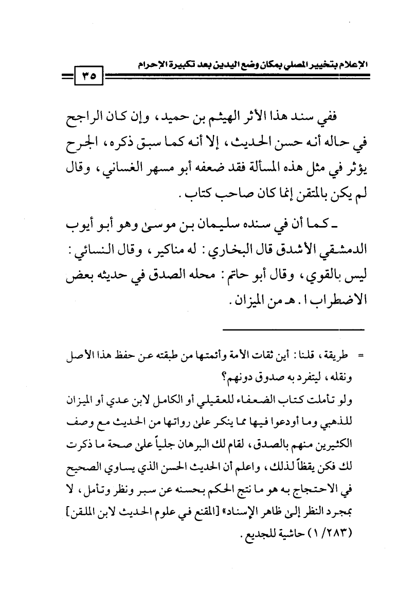 ولو تأملت كتاب الضعفاء للعقيلي أو الكامل لابن عبدي أو الميزان للذهبي وما أودعوا فيها مما ينكر على رواتها من الحديث مع وصف الكثيرين منهم بالصدق، لقام لك البرهان جليا على صحة ما ذكرت لك فكنت يقظا لذلك، واعلم أن الحديث الحسن الذي يساوي الصحيح في الاحتجاج به هو ما نتج عن الحكم بحسنه عن سبر ونظر وتأمل، لا بمجرد النظر إلى ظاهر الإسناد) (المقنع في علوم الحديث لابن الملقن) (283/ 1) حاشية للجديع.