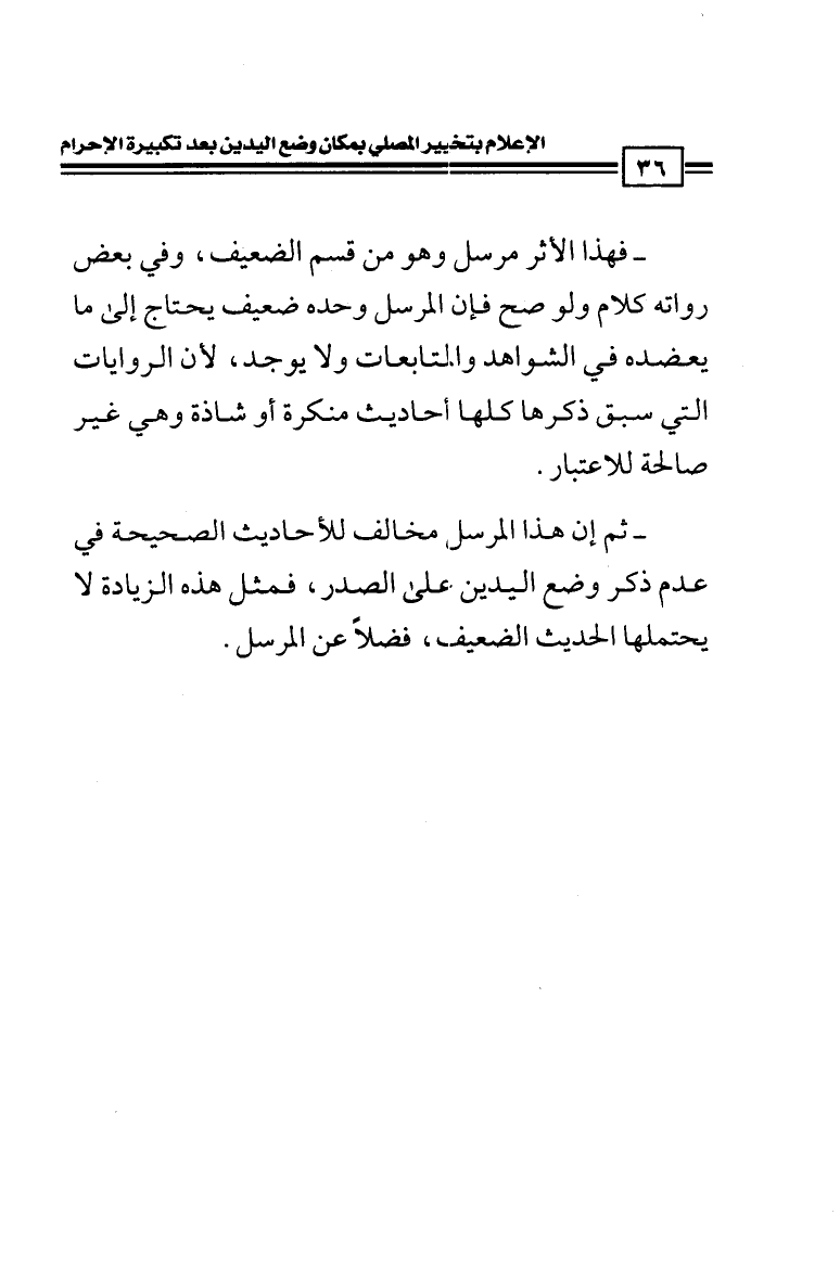 - ثم إن هذا المرسل مخالف للأحاديث الصحيحة في عدم ذكر وضع اليدين على الصدر، فمثل هذه الزيادة لا يحتملها الحديث الضعيف، فضلا عن المرسل.