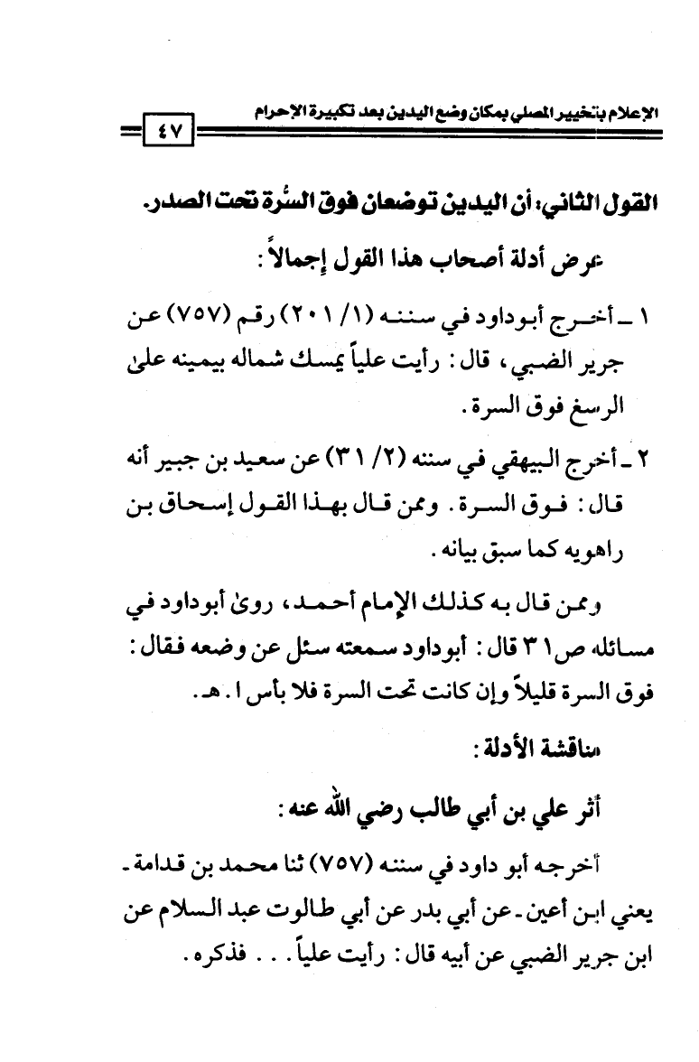 1 - أخرج أبو داود في سننه (1/ 201) رقم (757) عن جرير الضبي، قال: رأيت عليا يمسك شماله بيمينه على الرسغ فوق السرة.
