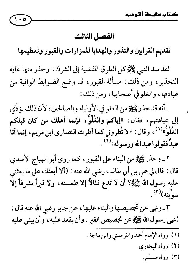 1 - أنه قد حذّر - صلى الله عليه وسلم - من الغلو في الأولياء والصالحين؛ لأن ذلك يؤدِّي إلى عبادتهم، فقال: «إياكم والغُلُوَّ، فإنما أهلك من كان قبلكم الغُلُوُّ» وقال: «لا تُطروني كما أطرتِ النصارى ابن مريم، إنما أنا عبدٌ فقولوا عبدُ الله ورسوله» .