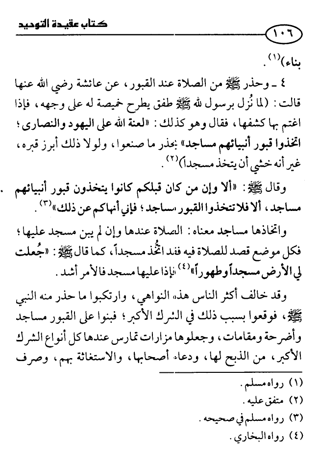 4 - وحذَّر - صلى الله عليه وسلم - من الصلاة عند القبور، عن عائشة رضي الله عنها قالت: «لما نُزِلَ برسول الله - صلى الله عليه وسلم - طفق يطرح خميصة له على وجهه، فإذا اغتم بها كشفها، فقال وهو كذلك: لعنةُ الله على اليهود والنصارى؛ اتخذوا قبور أنبيائهم مساجد، يحذرُ ما صنعوا، ولولا ذلك أبرز قبره، غير أنه خشي أن يُتَّخذَ مسجدًا» .