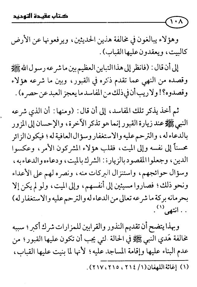 إلى أن قال: (فانظر إلى هذا التباين العظيم بين ما شرعه رسول الله - صلى الله عليه وسلم - وقصده من النهي عما تقدم ذكره في القبور، وبين ما شرعه هؤلاء وقصدوه؟ ! ولا ريبَ أن في ذلك من المفاسد ما يعجز العبد عن حصره) .