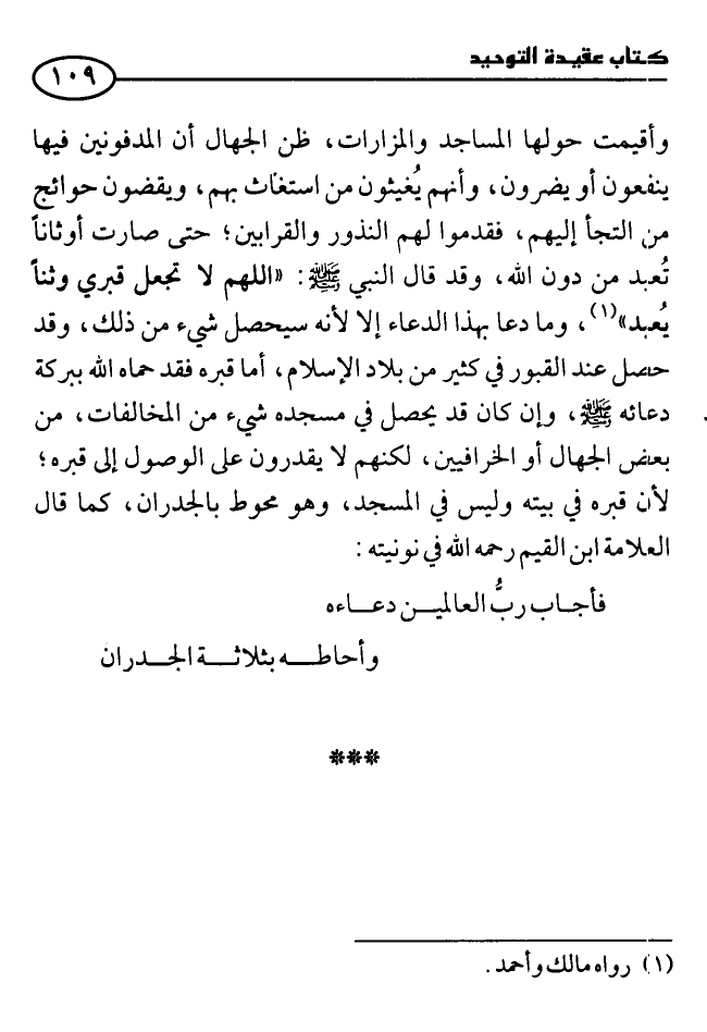 وأقيمت حولها المساجد والمزارات، ظن الجهال أن المدفونين فيها ينفعون أو يضرون، وأنهم يُغيثون من استغاث بهم، ويقضون حوائج من التجأ إليهم، فقدموا لهم النذور والقرابين؛ حتى صارت أوثانًا تُعبدُ من دون الله، وقد قال النبي - صلى الله عليه وسلم -: «اللهم لا تجعل قبري وثنًا يُعبد» وما دعا بهذا الدعاء إلا لأنه سيحصل شيء من ذلك، وقد حصل عند القبور في كثير من بلاد الإسلام، أما قبره فقد حماه الله ببركة دعائه - صلى الله عليه وسلم - وإن كان قد يحصل في مسجده شيء من المخالفات، من بعض الجهال أو الخرافيين، لكنهم لا يقدرون على الوصول إلى قبره؛ لأن قبره في بيته وليس في المسجد، وهو محوط بالجدران، كما قال العلامة ابن القيم - رحمه الله - في نونيته: