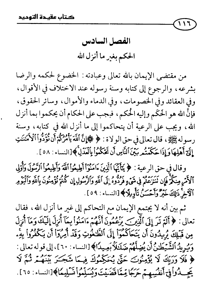من مقتضى الإيمان بالله تعالى وعبادته: الخضوع لحكمه والرضا بشرعه، والرجوع إلى كتابه وسنة رسوله عند الاختلاف في الأقوال، وفي العقائد وفي الخصومات، وفي الدماء والأموال، وسائر الحقوق، فإنَّ الله هو الحكَمُ وإليه الحُكمُ، فيجبُ على الحكام أن يحكموا بما أنزل الله، ويجب على الرَّعيَّة أن يتحاكموا إلى ما أنزل الله في كتابه، وسنة رسوله - صلى الله عليه وسلم -، قال تعالى في حق الولاة: {إِنَّ اللَّهَ يَأْمُرُكُمْ أَنْ تُؤَدُّوا الْأَمَانَاتِ إِلَى أَهْلِهَا وَإِذَا حَكَمْتُمْ بَيْنَ النَّاسِ أَنْ تَحْكُمُوا بِالْعَدْلِ} [النساء: 58] .