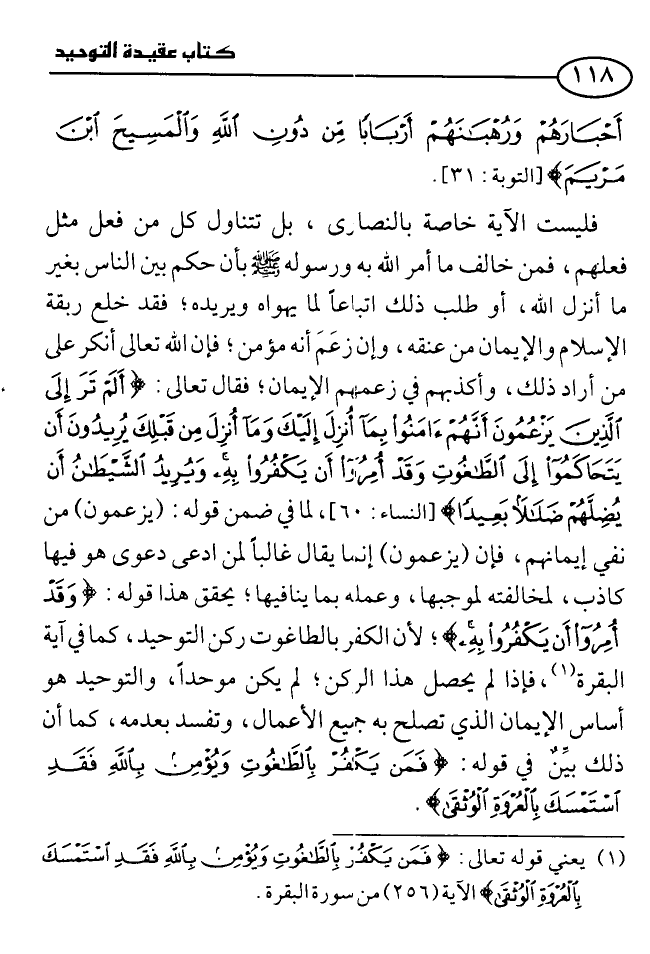 فليست الآية خاصة بالنصارى، بل تتناول كل من فعل مثل فعلهم، فمن خالف ما أمر الله به ورسوله - صلى الله عليه وسلم - بأن حكم بين الناس بغير ما أنزل الله، أو طلب ذلك اتباعًا لما يهواه ويريده؛ فقد خلع ربقة الإسلام والإيمان من عنقه، وإن زَعمَ أنه مؤمن؛ فإن الله تعالى أنكر على من أراد ذلك، وأكذبهم في زعمهم الإيمان؛ فقال تعالى: {أَلَمْ تَرَ إِلَى الَّذِينَ يَزْعُمُونَ أَنَّهُمْ آمَنُوا بِمَا أُنْزِلَ إِلَيْكَ وَمَا أُنْزِلَ مِنْ قَبْلِكَ يُرِيدُونَ أَنْ يَتَحَاكَمُوا إِلَى الطَّاغُوتِ وَقَدْ أُمِرُوا أَنْ يَكْفُرُوا بِهِ وَيُرِيدُ الشَّيْطَانُ أَنْ يُضِلَّهُمْ ضَلَالًا بَعِيدًا} [النساء: 60] لما في ضمن قوله: (يزعمون) من نفي إيمانهم، فإنَّ (يزعمون) إنما يقال غالبًا لمن ادعى دعوى هو فيها كاذب، لمخالفته لموجبها، وعمله بما ينافيها؛ يحقق هذا قوله: {وَقَدْ أُمِرُوا أَنْ يَكْفُرُوا بِهِ} ؛ لأن الكُفر بالطاغوت ركن التوحيد، كما في آية البقرة فإذا لم يَحصُلْ هذا الركن؛ لم يكن مُوحِّدًا، والتوحيدُ هو أساس الإيمان الذي تصلح به جميع الأعمال، وتفسد بعدمه، كما أن ذلك بيِّنٌ في قوله: {فَمَنْ يَكْفُرْ بِالطَّاغُوتِ وَيُؤْمِنْ بِاللَّهِ فَقَدِ اسْتَمْسَكَ بِالْعُرْوَةِ الْوُثْقَى}