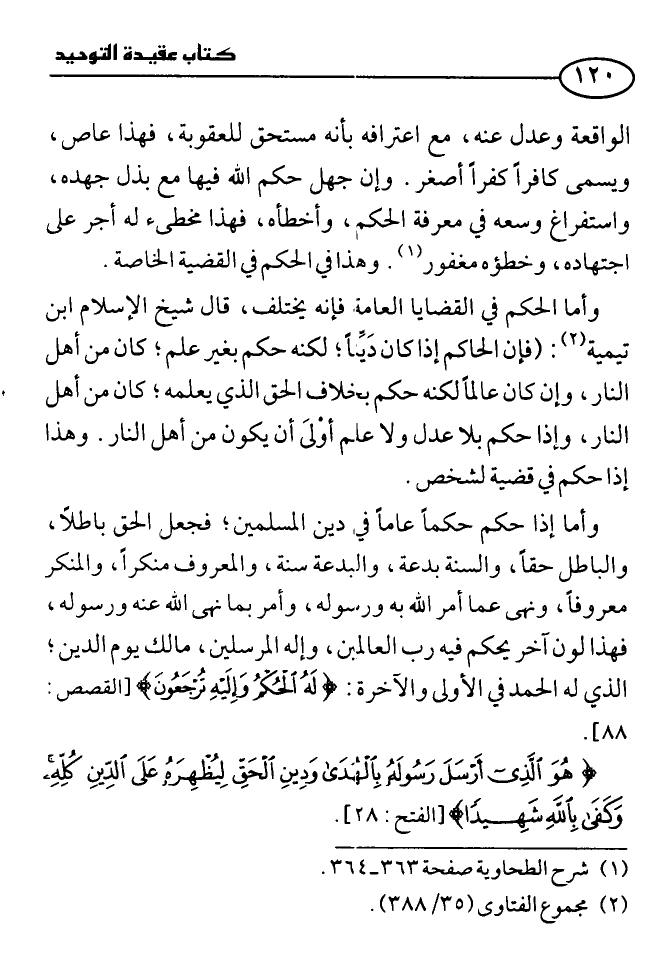 الواقعة وعدل عنه، مع اعترافه بأنه مستحق للعقوبة، فهذا عاص، ويُسمَّى كافرًا كفرًا أصغر. وإن جهل حكم الله فيها مع بذل جهده، واستفراغ وسعه في معرفة الحكم، وأخطأه، فهذا مُخطئ له أجر على اجتهاده، وخطؤه مغفور. وهذا في الحكم في القضية الخاصة.