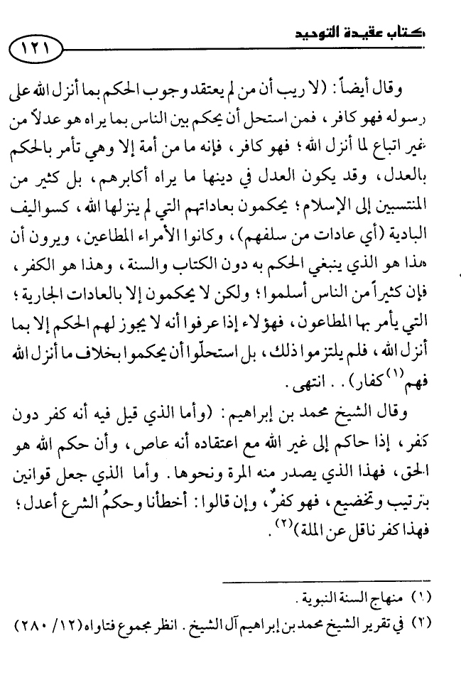وقال أيضًا: (لا ريبَ أن من لم يعتقد وجوب الحكم بما أنزل الله على رسوله فهو كافر، فمن استحل أن يحكم بين الناس بما يراه هو عدلًا من غير اتباع لما أنزل الله؛ فهو كافر، فإنّهُ ما من أمة إلا وهي تأمر بالحكم بالعدل، وقد يكون العدل في دينها ما يراه أكابرهم، بل كثير من المنتسبين إلى الإسلام يحكمون بعاداتهم التي لم ينزلها الله، كسواليف البادية (أي عادات من سلفهم) ، وكانوا الأمراءَ المطاعين، ويرون أن هذا هو الذي ينبغي الحكم به دون الكتاب والسنة، وهذا هو الكفر، فإن كثيرًا من الناس أسلموا؛ ولكن لا يحكمون إلا بالعادات الجارية؛ التي يأمر بها المطاعون، فهؤلاء إذا عرفوا أنه لا يجوز لهم الحكم إلا بما أنزل الله فلم يلتزموا ذلك، بل استَحَلّوا أن يحكموا بخلاف ما أنزل الله فهم كفار) انتهى.