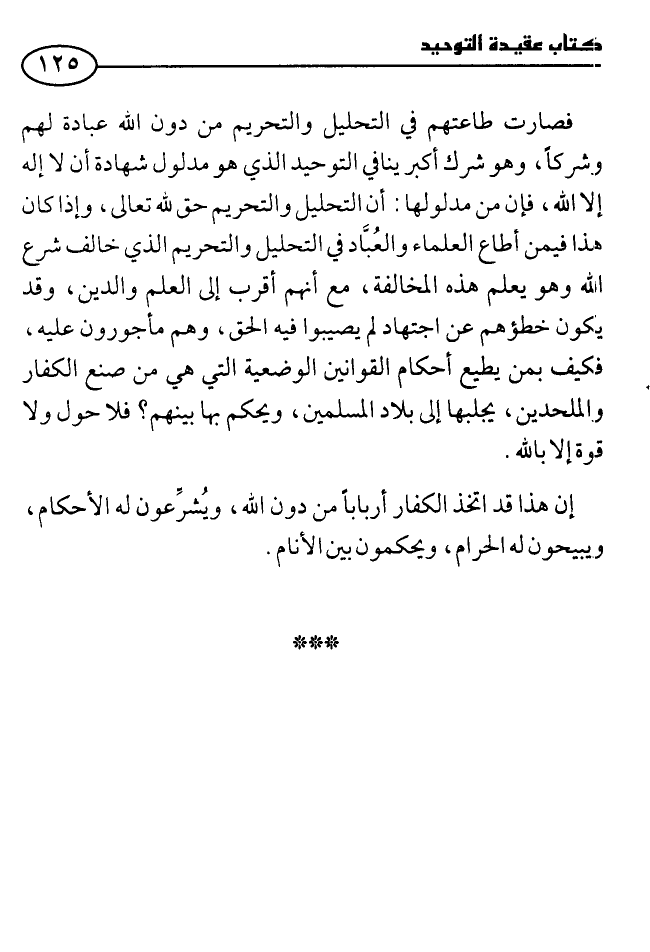 فصارت طاعتُهم في التحليل والتحريم من دون الله عبادة لهم وشركًا، وهو شركٌ أكبرُ يُنافي التوحيد الذي هو مدلول شهادة أن لا إله إلا الله، فإنّ مِنْ مدلولها: أنَّ التحليل والتحريم حقٌّ لله تعالى، وإذا كان هذا فيمن أطاع العلماء والعُبَّاد في التحليل والتحريم الذي يخالف شرع الله وهو يعلم هذه المخالفة، مع أنهم أقرب إلى العلم والدين، وقد يكونُ خطؤهم عن اجتهاد لم يصيبوا فيه الحق، وهم مأجورون عليه، فكيفَ بمن يُطيعُ أحكام القوانين الوضعية التي هي من صنع الكفار والملحدين، يجلبها إلى بلاد المسلمين، ويحكم بها بينهم؟ فلا حول ولا قوة إلا بالله.