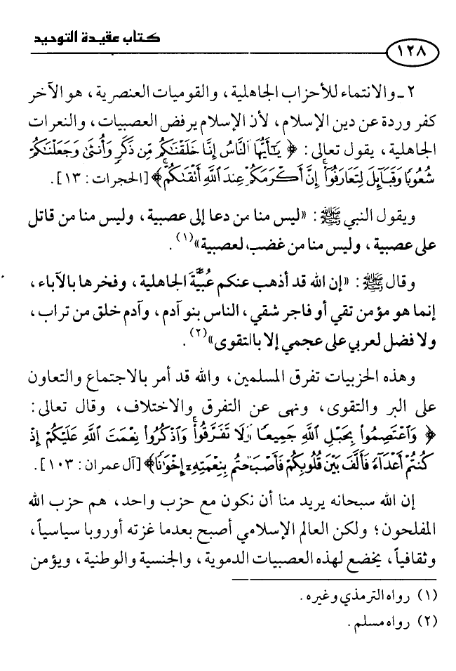 2 - والانتماء للأحزاب الجاهلية، والقوميات العنصرية، هو الآخر كُفرٌ وردَّة عن دين الإسلام؛ لأنَّ الإسلام يرفُضُ العصبيات، والنعرات الجاهلية، يقول تعالى: {يَاأَيُّهَا النَّاسُ إِنَّا خَلَقْنَاكُمْ مِنْ ذَكَرٍ وَأُنْثَى وَجَعَلْنَاكُمْ شُعُوبًا وَقَبَائِلَ لِتَعَارَفُوا إِنَّ أَكْرَمَكُمْ عِنْدَ اللَّهِ أَتْقَاكُمْ} [الحجرات: 13] .