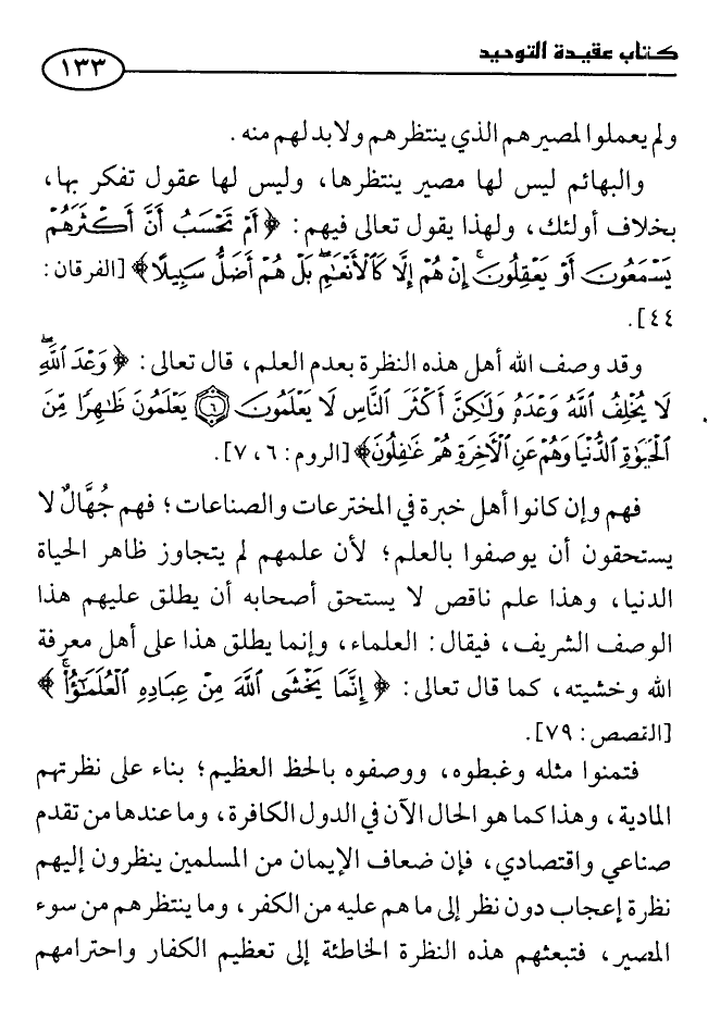 فهم وإن كانوا أهل خبرة في المخترعات والصناعات؛ فهم جُهَّالٌ لا يستحقون أن يُوصَفوا بالعلم؛ لأن علمهم لم يتجاوز ظاهر الحياة الدنيا، وهذا علم ناقص لا يستحق أصحابه أن يطلق عليهم هذا الوصف الشريف، فيقال: العلماء، وإنما يطلق هذا على أهل معرفة الله وخشيته، كما قال تعالى: {إِنَّمَا يَخْشَى اللَّهَ مِنْ عِبَادِهِ الْعُلَمَاءُ} [فاطر: 28] .