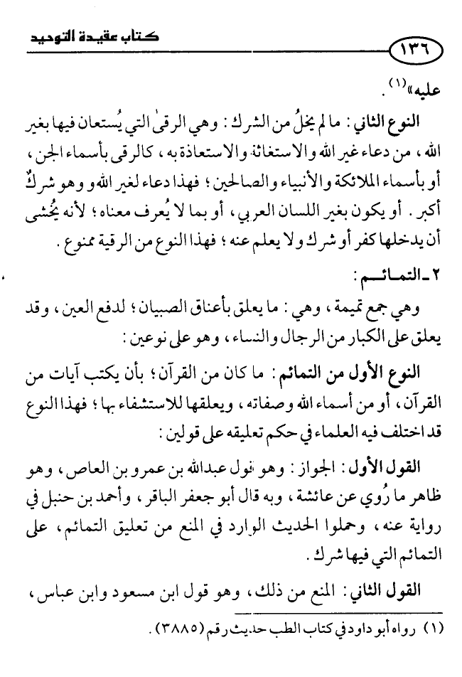 النوع الأول من التمائم: ما كان من القرآن؛ بأن يكتب آيات من القرآن، أو من أسماء الله وصفاته، ويعلقها للاستشفاء بها؛ فهذا النوع قد اختلف فيه العلماءُ في حكم تعليقه على قولين: