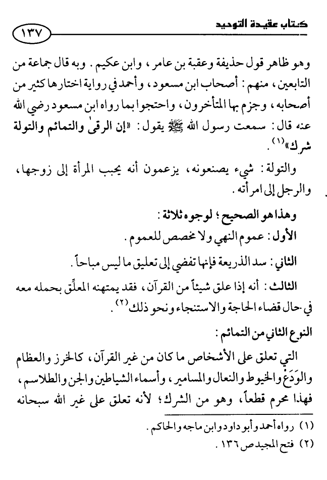 وهو قول ابن مسعود وابن عباس، وهو ظاهر قول حذيفة وعقبة بن عامر، وابن عكيم، وبه قال جماعة من التابعين منهم: أصحابُ ابن مسعود، وأحمد في رواية اختارها كثير من أصحابه، وجزم بها المتأخرون، واحتجوا بما رواهُ ابن مسعود - رضي الله عنه - قال: «سمعت رسول الله - صلى الله عليه وسلم - يقول: إن الرقى والتمائم والتولة شرك» .