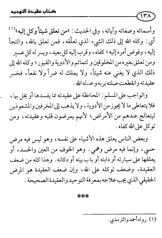 وأسمائه وصفاته وآياته، وفي الحديث: «من تعلّق شيئًا وُكّل إليه» أي: وكّله الله إلى ذلك الشيء الذي تعلَّقه، فمن تعلّق بالله، والتجأ إليه، وفوّض أمره إليه كفاه، وقرّب إليه كل بعيد، ويسّر له كلّ عسير. ومن تعلّق بغيره من المخلوقين والتمائم والأدوية والقبور وكله الله إلى ذلك الذي لا يغني عنه شيئًا، ولا يملك له ضرًّا ولا نفعًا، فخسر عقيدته وانقطعت صلته بربه وخذله الله.