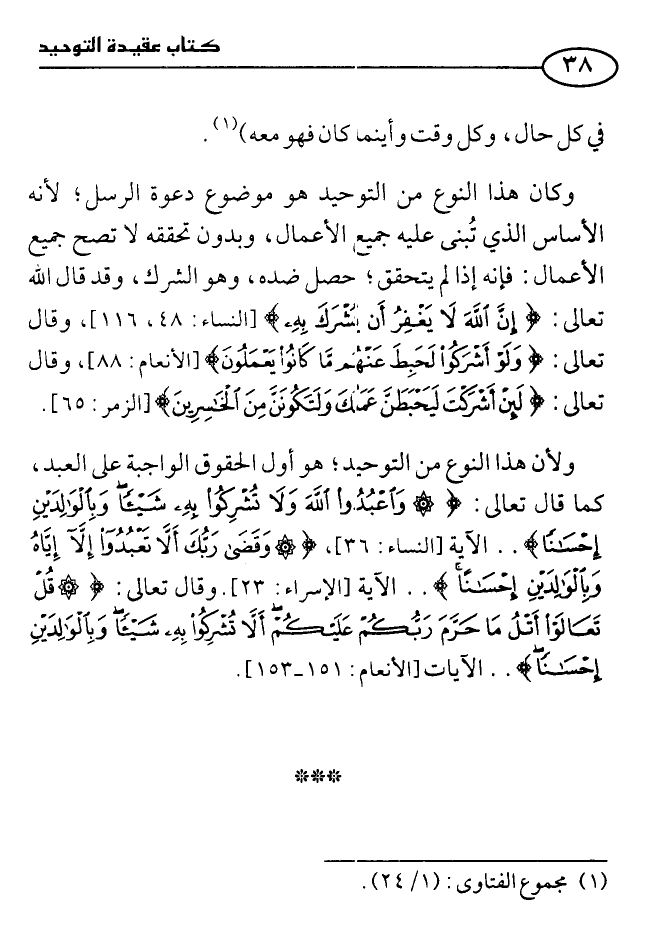 ولأن هذا النوع من التوحيد هو أول الحقوق الواجبة على العبد، كما قال تعالى: {وَاعْبُدُوا اللَّهَ وَلَا تُشْرِكُوا بِهِ شَيْئًا وَبِالْوَالِدَيْنِ إِحْسَانًا} الآية [النساء: 36] ، {وَقَضَى رَبُّكَ أَلَّا تَعْبُدُوا إِلَّا إِيَّاهُ وَبِالْوَالِدَيْنِ إِحْسَانًا} الآية [الإسراء: 23] ، وقال تعالى: {قُلْ تَعَالَوْا أَتْلُ مَا حَرَّمَ رَبُّكُمْ عَلَيْكُمْ أَلَّا تُشْرِكُوا بِهِ شَيْئًا وَبِالْوَالِدَيْنِ إِحْسَانًا} الآيات [الأنعام: 151- 153] .