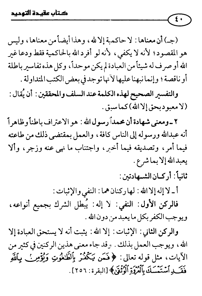 (ج) أن معناها: لا حاكميّةَ إلا لله، وهذا أيضًا جزء من معناها، وليس هو المقصود؛ لأنه لا يكفي؛ لأنه لو أفرد الله بالحاكمية فقط ودعا غير الله أو صرف له شيئًا من العبادة لم يكن موحدًا، وكل هذه تفاسير باطلة أو ناقصة؛ وإنما نبهنا عليها لأنها توجد في بعض الكتب المتداولة.