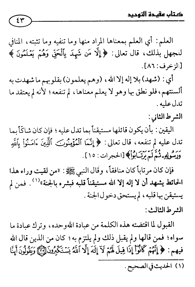 العلم: أي العلم بمعناها المراد منها وما تنفيه وما تُثبته، المنافي للجهل بذلك، قال تعالى: {إِلَّا مَنْ شَهِدَ بِالْحَقِّ وَهُمْ يَعْلَمُونَ} [الزخرف: 86] .