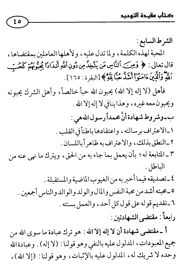 المحبة لهذه الكلمة، ولما تدل عليه، ولأهلها العاملين بمقتضاها، قال تعالى: {وَمِنَ النَّاسِ مَنْ يَتَّخِذُ مِنْ دُونِ اللَّهِ أَنْدَادًا يُحِبُّونَهُمْ كَحُبِّ اللَّهِ وَالَّذِينَ آمَنُوا أَشَدُّ حُبًّا لِلَّهِ} [البقرة: 165] .