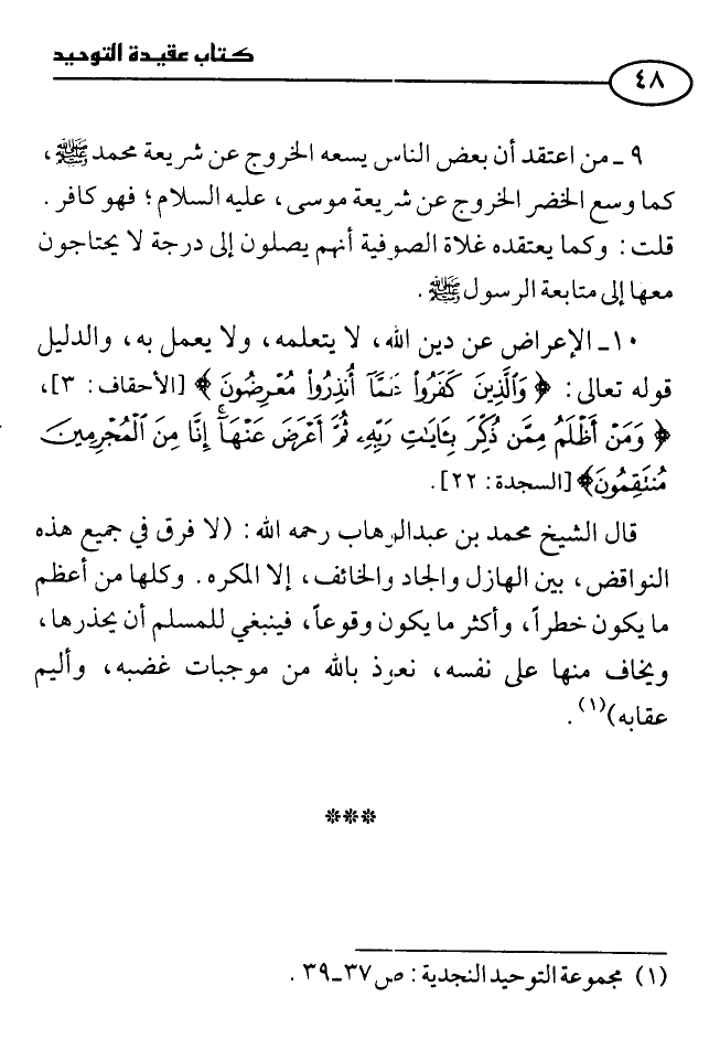 9 - من اعتقد أن بعض الناس يسعه الخروج عن شريعة محمد - صلى الله عليه وسلم - كما وسع الخضر الخروج عن شريعة موسى - عليه السلام - فهو كافر. قلت: وكما يعتقده غلاة الصوفية أنهم يصلون إلى درجةٍ لا يحتاجون معها إلى متابعة الرسول - صلى الله عليه وسلم -.