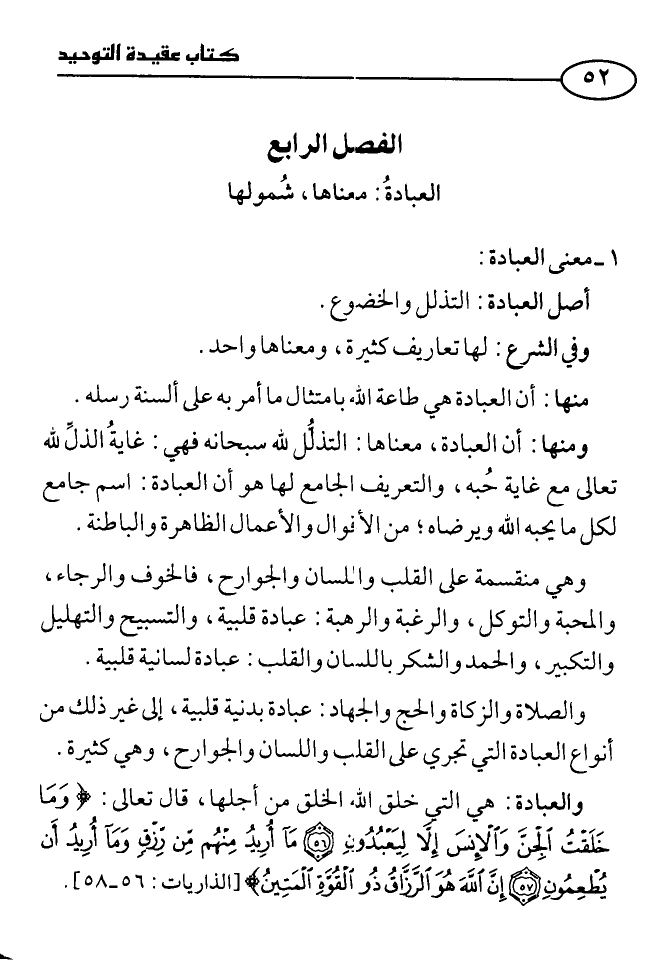 والعبادةُ: هي التي خلق الله الخلق من أجلها، قال تعالى: {وَمَا خَلَقْتُ الْجِنَّ وَالْإِنْسَ إِلَّا لِيَعْبُدُونِ مَا أُرِيدُ مِنْهُمْ مِنْ رِزْقٍ وَمَا أُرِيدُ أَنْ يُطْعِمُونِ إِنَّ اللَّهَ هُوَ الرَّزَّاقُ ذُو الْقُوَّةِ الْمَتِينُ} [الذاريات: 56- 58] .