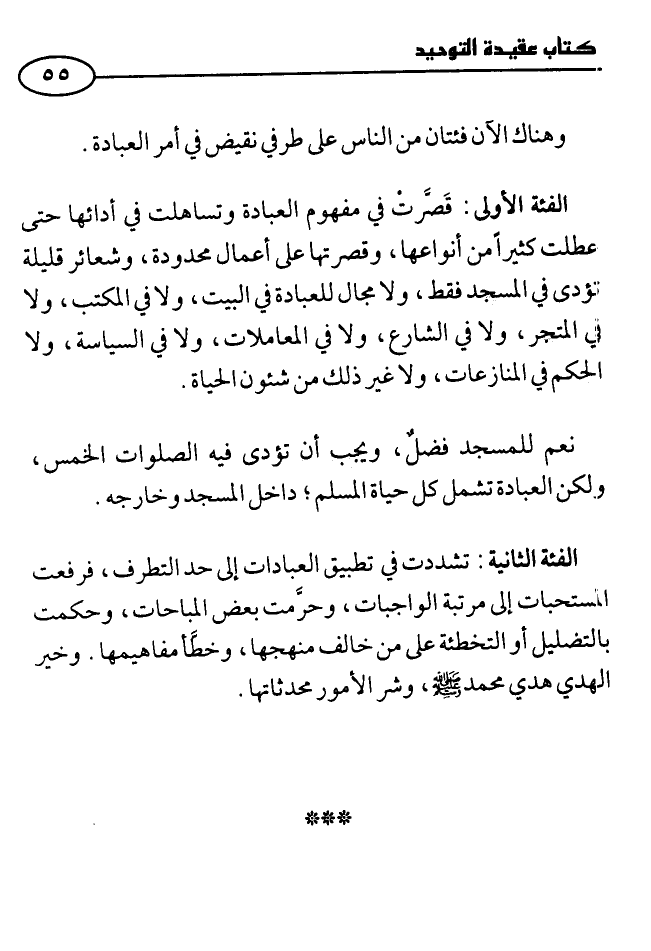 الفئة الأولى: قصَّرت في مفهوم العبادة وتساهلت في أدائها حتى عطلت كثيرًا من أنواعها، وقصرتها على أعمال محدودة، وشعائر قليلة تؤدى في المسجد فقط، ولا مجال للعبادة في البيت، ولا في المكتب، ولا في المتجر، ولا في الشارع، ولا في المعاملات، ولا في السياسة، ولا الحكم في المنازعات، ولا غير ذلك من شئون الحياة.
