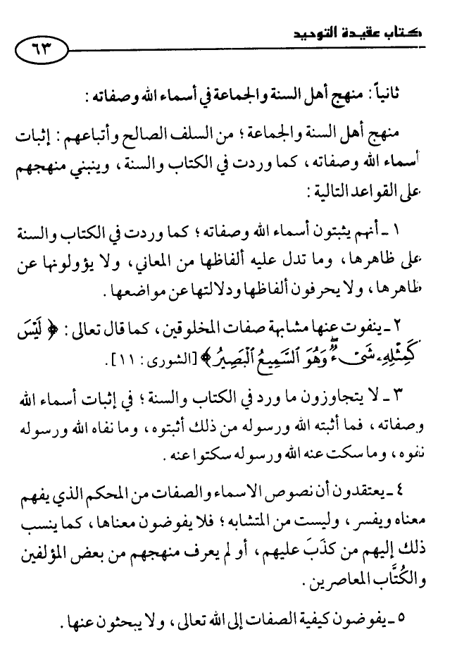 2 - يَنفونَ عنها مشابهة صفات المخلوقين، كما قال تعالى: {لَيْسَ كَمِثْلِهِ شَيْءٌ وَهُوَ السَّمِيعُ الْبَصِيرُ} [الشورى: 11] .