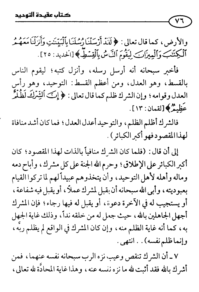 فأخبر سبحانه أنه أرسل رسله، وأنزلَ كُتبه؛ ليقوم الناس بالقسط، وهو العدل، ومن أعظم القسط: التوحيد، وهو رأس العدل وقوامه؛ وإن الشرك ظلم كما قال تعالى: {إِنَّ الشِّرْكَ لَظُلْمٌ عَظِيمٌ} [لقمان: 13] .