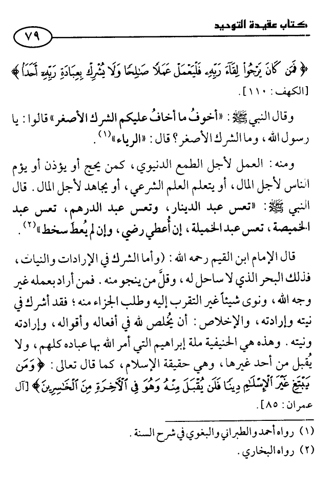 قال الإمام ابن القيم - رحمه الله -: (وأما الشرك في الإرادات والنيات فذلك البحر الذي لا ساحل له، وقلَّ من ينجو منه. فمن أراد بعمله غير وجه الله، ونوى شيئًا غير التقرب إليه وطلب الجزاء منه؛ فقد أشرك في نيته وإرادته، والإخلاص: أن يُخلصَ لله في أفعاله وأقواله، وإرادته ونيته. وهذه هي الحنيفية ملة إبراهيم التي أمر الله بها عباده كلهم، ولا يُقبلُ من أحد غيرها، وهي حقيقة الإسلام، كما قال تعالى: {وَمَنْ يَبْتَغِ غَيْرَ الْإِسْلَامِ دِينًا فَلَنْ يُقْبَلَ مِنْهُ وَهُوَ فِي الْآخِرَةِ مِنَ الْخَاسِرِينَ} [آل عمران: 85] .