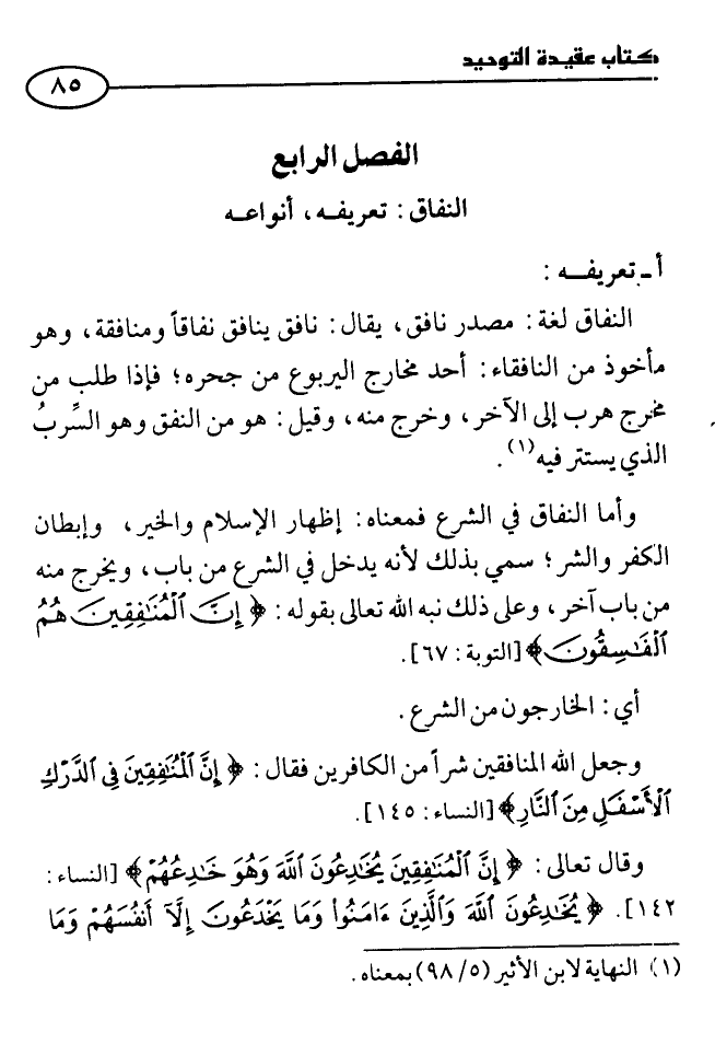 وأما النفاق في الشرع فمعناه: إظهارُ الإسلام والخير، وإبطانُ الكفر والشر؛ سمي بذلك لأنه يدخل في الشرع من باب، ويخرج منه من باب آخر، وعلى ذلك نبه الله تعالى بقوله: {إِنَّ الْمُنَافِقِينَ هُمُ الْفَاسِقُونَ} [التوبة: 67] .
