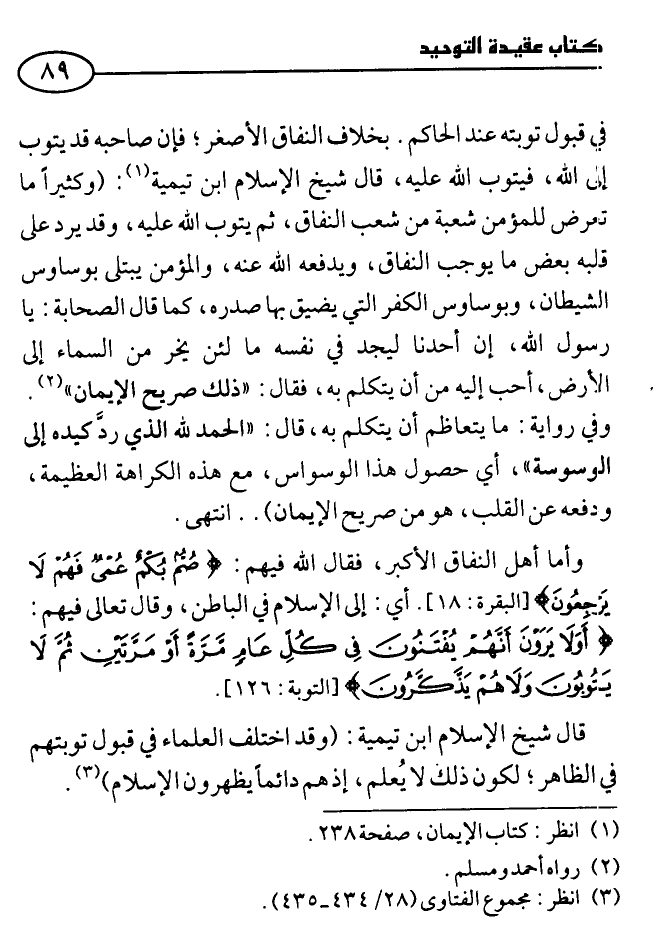في قبول توبته عند الحاكم. بخلاف النفاق الأصغر؛ فإن صاحبه قد يتوب إلى الله، فيتوب الله عليه، قال شيخ الإسلام ابن تيمية (وكثيرًا ما تعرض للمؤمن شعبة من شعب النفاق، ثم يتوبُ الله عليه، وقد يرد على قلبه بعض ما يوجب النفاق، ويدفعه الله عنه، والمؤمن يبتلى بوساوس الشيطان، وبوساوس الكفر التي يضيق بها صدره، كما قال الصحابة: يا رسول الله، إن أحدنا ليجد في نفسه ما لئن يخرّ من السماء إلى الأرض أحب إليه من أن يتكلم به، فقال: «ذلك صريح الإيمان» . وفي رواية: ما يتعاظم أن يتكلم به، قال: «الحمدُ لله الذي ردَّ كيده إلى الوسوسة» ، أي حصول هذا الوسواس، مع هذه الكراهة العظيمة، ودفعه عن القلب، هو من صريح الإيمان) انتهى.