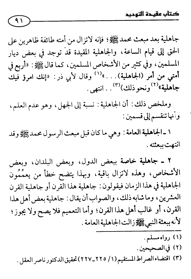 وملخص ذلك: أن الجاهلية: نسبة إلى الجهل، وهو عدم العلم، وأنها تنقسم إلى قسمين: