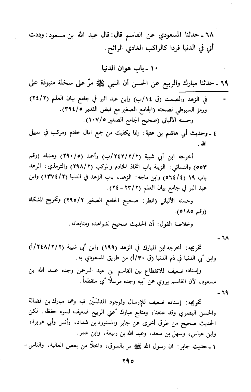 69 - حَدَّثَنَا مُبَارَكٌ، وَالرَّبِيعُ، عَنِ الْحَسَنِ , أَنَّ النَّبِيَّ صَلَّى اللهُ عَلَيْهِ وَسَلَّمَ مَرَّ عَلَى سَخْلَةٍ مَنْبُوذَةٍ عَلَى -[296]- ظَهْرِ الطَّرِيقِ، فَقَالَ: «§أَتَرَوْنَ هَذِهِ هَيِّنَةً عَلَى أَهْلِهَا، فَوَاللَّهِ لَلدُّنْيَا أَهْوَنُ عَلَى اللَّهِ مِنْ هَذِهِ عَلَى أَهْلِهَا»