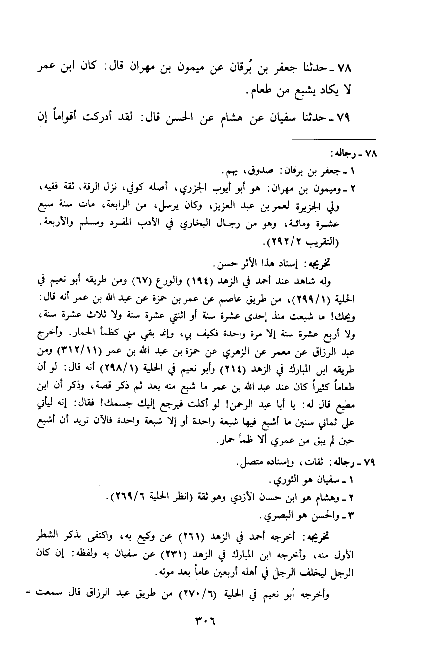 78 - حَدَّثَنَا جَعْفَرُ بْنُ بُرْقَانَ، عَنْ مَيْمُونِ بْنِ مِهْرَانَ، قَالَ: §كَانَ ابْنُ عُمَرَ لَا يَكَادُ يَشْبَعُ مِنْ طَعَامٍ