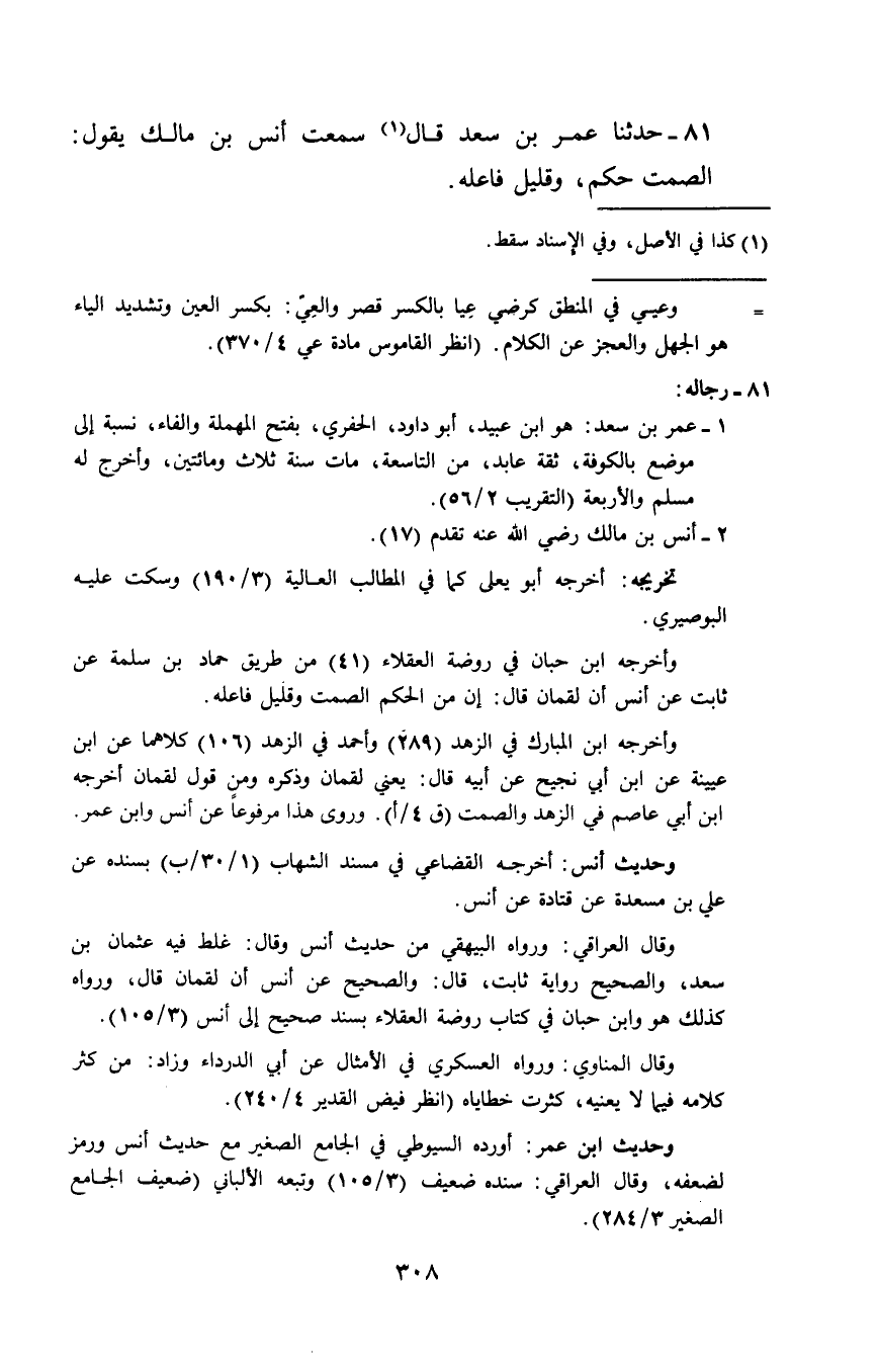 81 - حَدَّثَنَا عُمَرُ بْنُ سَعْدٍ، قَالَ: سَمِعْتُ أَنَسَ بْنَ مَالِكٍ يَقُولُ: §الصَّمْتُ حُكْمٌ، وَقَلِيلٌ فَاعِلُهُ