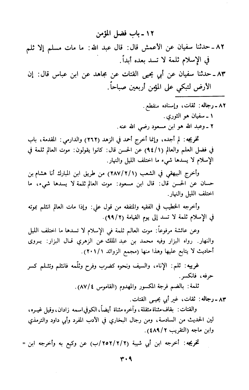 82 - حَدَّثَنَا سُفْيَانُ، عَنِ الْأَعْمَشِ، قَالَ: قَالَ عَبْدُ اللَّهِ: §مَا مَاتَ مُسْلِمٌ إِلَّا ثُلِمَ فِي الْإِسْلَامِ ثَلْمَةً لَا تُسَدُّ بَعْدَهُ أَبَدًا