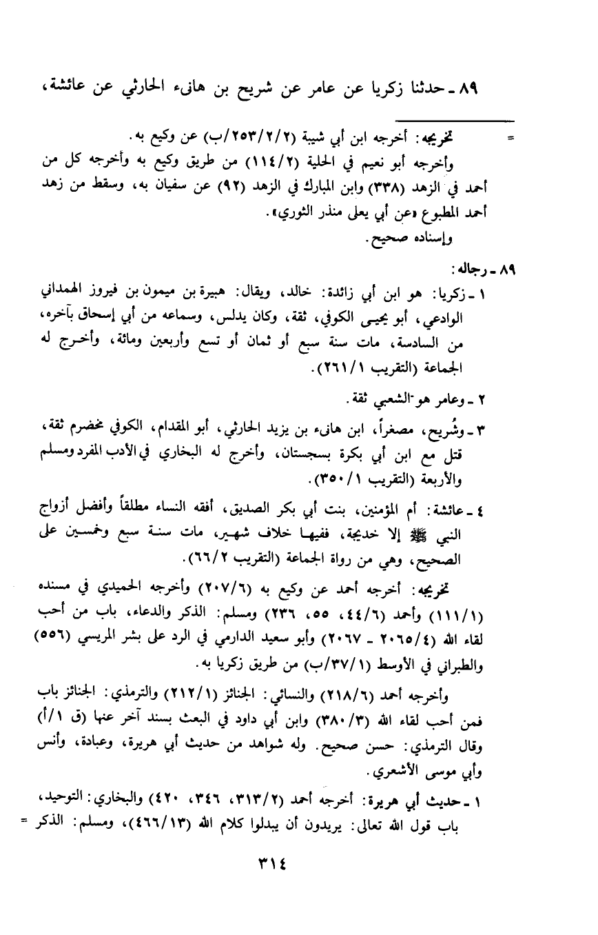 89 - حَدَّثَنَا زَكَرِيَا، عَنْ عَامِرٍ، عَنْ شُرَيْحِ بْنِ هَانِئٍ الْحَارِثِيِّ، عَنْ عَائِشَةَ، -[315]- قَالَتْ: قَالَ رَسُولُ اللَّهِ صَلَّى اللهُ عَلَيْهِ وَسَلَّمَ: «§مَنْ أَحَبَّ لِقَاءَ اللَّهِ أَحَبَّ اللَّهُ لِقَاءَهُ، وَمَنْ كَرِهَ لِقَاءَ اللَّهِ كَرِهَ اللَّهُ لِقَاءَهُ، وَالْمَوْتُ قَبْلَ لِقَاءِ اللَّهِ» ، يَعْنِي قَدَّرَ اللَّهُ عَلَيْهِ الْمَوْتَ قَبْلَ لِقَائِهِ
