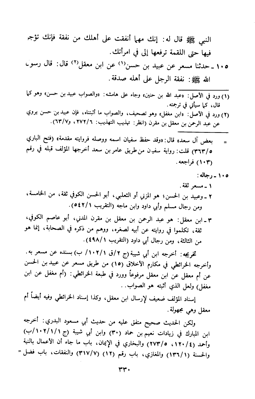 105 - حَدَّثَنَا مِسْعَرٌ، عَنْ عُبَيْدِ بْنِ حَسَنٍ، عَنِ ابْنِ مَعْقِلٍ قَالَ: قَالَ رَسُولُ اللَّهِ صَلَّى اللهُ عَلَيْهِ وَسَلَّمَ: «§نَفَقَةُ الرَّجُلِ عَلَى أَهْلِهِ صَدَقَةٌ»