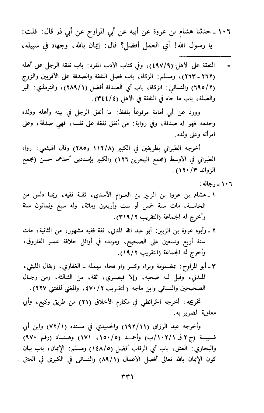 106 - حَدَّثَنَا هِشَامُ بْنُ عُرْوَةَ، عَنْ أَبِيهِ، عَنْ أَبِي الْمُرَاوِحِ، عَنْ أَبِي ذَرٍّ قَالَ: §قُلْتُ: يَا رَسُولَ اللَّهِ أَيُّ الْعَمَلِ أَفْضَلُ؟ قَالَ: «إِيمَانٌ بِاللَّهِ، وَجِهَادٌ فِي سَبِيلِهِ» ، -[332]- قَالَ: قُلْتُ: يَا رَسُولَ اللَّهِ أَرَأَيْتَ إِنْ ضَعُفْتُ عَنْ ذَلِكَ؟ قَالَ: «تُعِينُ صَانعًا أَوْ تَصْنَعُ لِأَخْرَقَ» ، قَالَ: قُلْتُ: يَا رَسُولَ اللَّهِ أَرَأَيْتَ إِنْ -[333]- ضَعُفْتُ عَنْ ذَلِكَ؟ قَالَ: «تَدَعُ النَّاسَ مِنْ شَرٍّ، فَإِنَّهَا صَدَقَةٌ تَصَدَّقْ بِهَا عَلَى نَفْسِكَ» ، قَالَ: قُلْتُ: يَا رَسُولَ اللَّهِ أَيُّ الرِّقَابِ أَفْضَلُ؟ قَالَ: «أَغْلَاهَا ثَمَنًا، وَأَنْفَسُهَا عِنْدَ أَهْلِهَا»