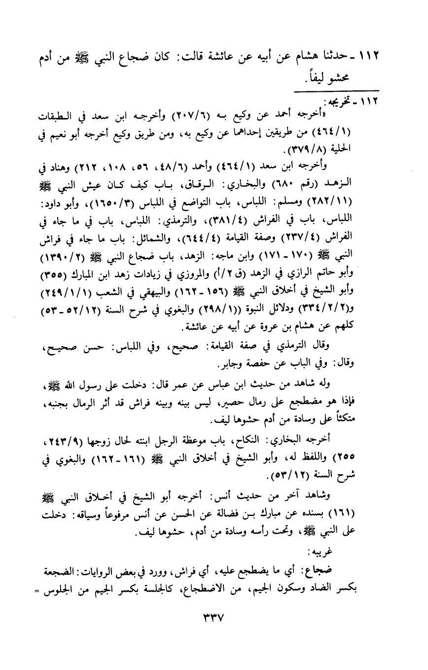 112 - حَدَّثَنَا هِشَامٌ، عَنْ أَبِيهِ، عَنْ عَائِشَةَ قَالَتْ: §كَانَ ضِجَاعُ النَّبِيِّ صَلَّى اللهُ عَلَيْهِ وَسَلَّمَ مِنْ أَدَمٍ مَحْشُوٍّ لِيفًا