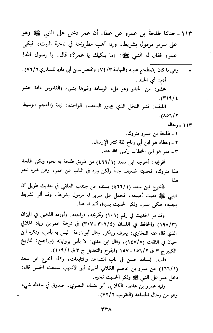 113 - حَدَّثَنَا طَلْحَةُ بْنُ عَمْرٍو، عَنْ عَطَاءٍ، أَنَّ عُمَرَ دَخَلَ عَلَى النَّبِيِّ صَلَّى اللهُ عَلَيْهِ وَسَلَّمَ وَهُوَ عَلَى سَرِيرٍ مَرْمُولٍ بِشَرِيطٍ، وَإِذَا أُهُبٌ مَطْرُوحَةٌ فِي نَاحِيَةِ الْبَيْتِ، فَبَكَى عُمَرُ، فَقَالَ لَهُ النَّبِيُّ صَلَّى اللهُ عَلَيْهِ وَسَلَّمَ: «§مَا يُبْكِيكَ يَا عُمَرُ؟» قَالَ: يَا رَسُولَ اللَّهِ -[339]- ذَكَرْتُ كِسْرَى، وَقَيْصَرَ وَمَا هُمَا فِيهِ مِنْ أَمْرِ الدُّنْيَا، فَقَالَ النَّبِيُّ صَلَّى اللهُ عَلَيْهِ وَسَلَّمَ: " يَا عُمَرُ لَوْ شِئْتُ أَنْ تَسِيرَ الْجِبَالُ الرَّاسِيَاتُ ذَهَبًا وَفِضَّةً لَسَارَتْ